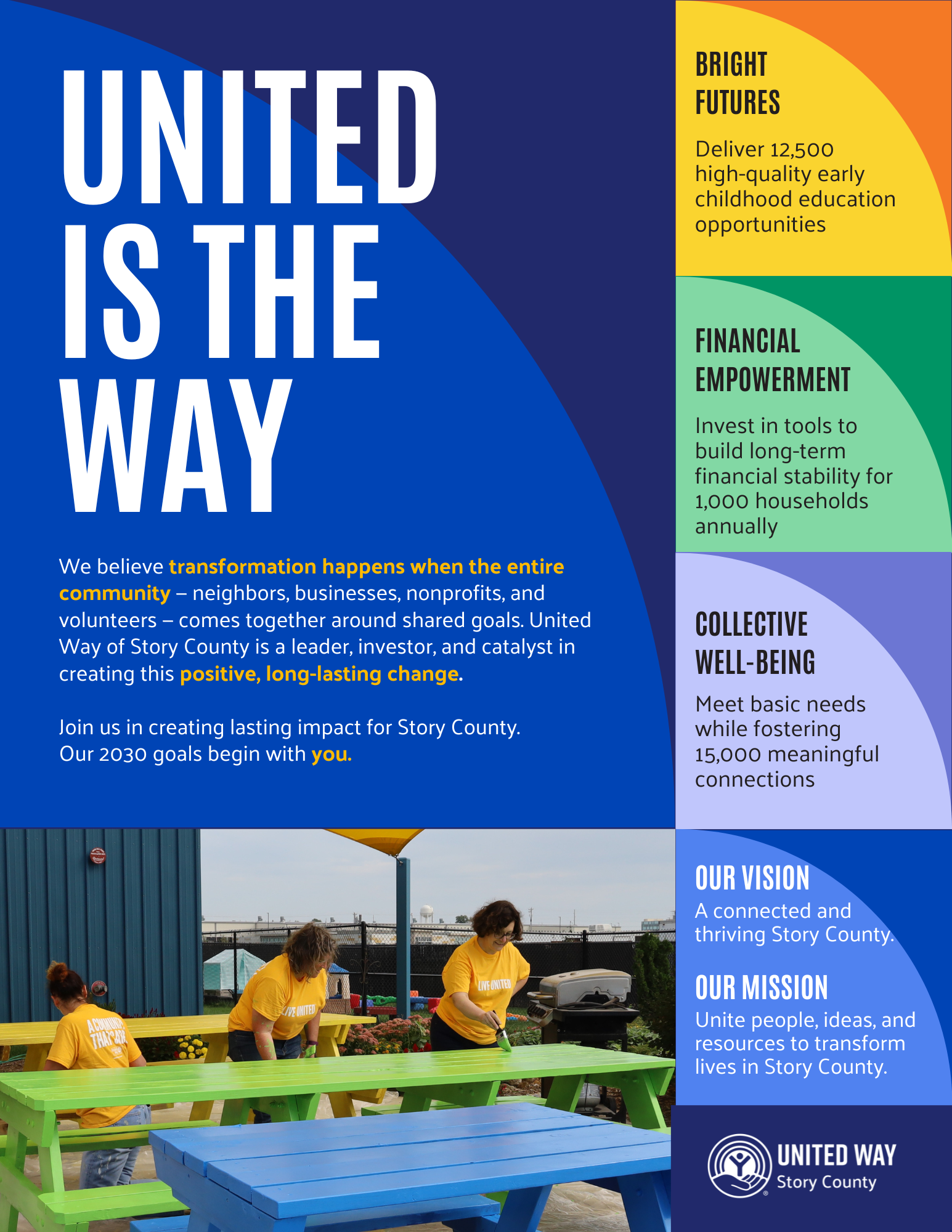 United Way of Story County creates lasting change through three key impact areas—Bright Futures, Financial Empowerment, and Collective Well-Being—ensuring children succeed, families build stability, and our community thrives together.