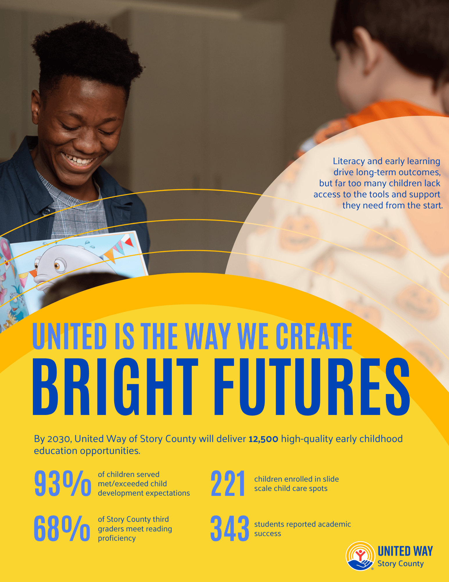 We aim to create opportunities for youth by making sure all children are prepared for school and achieve their third-grade reading goals. By working together with local organizations, we hope to pave the way for every child in Story County to succeed academically.