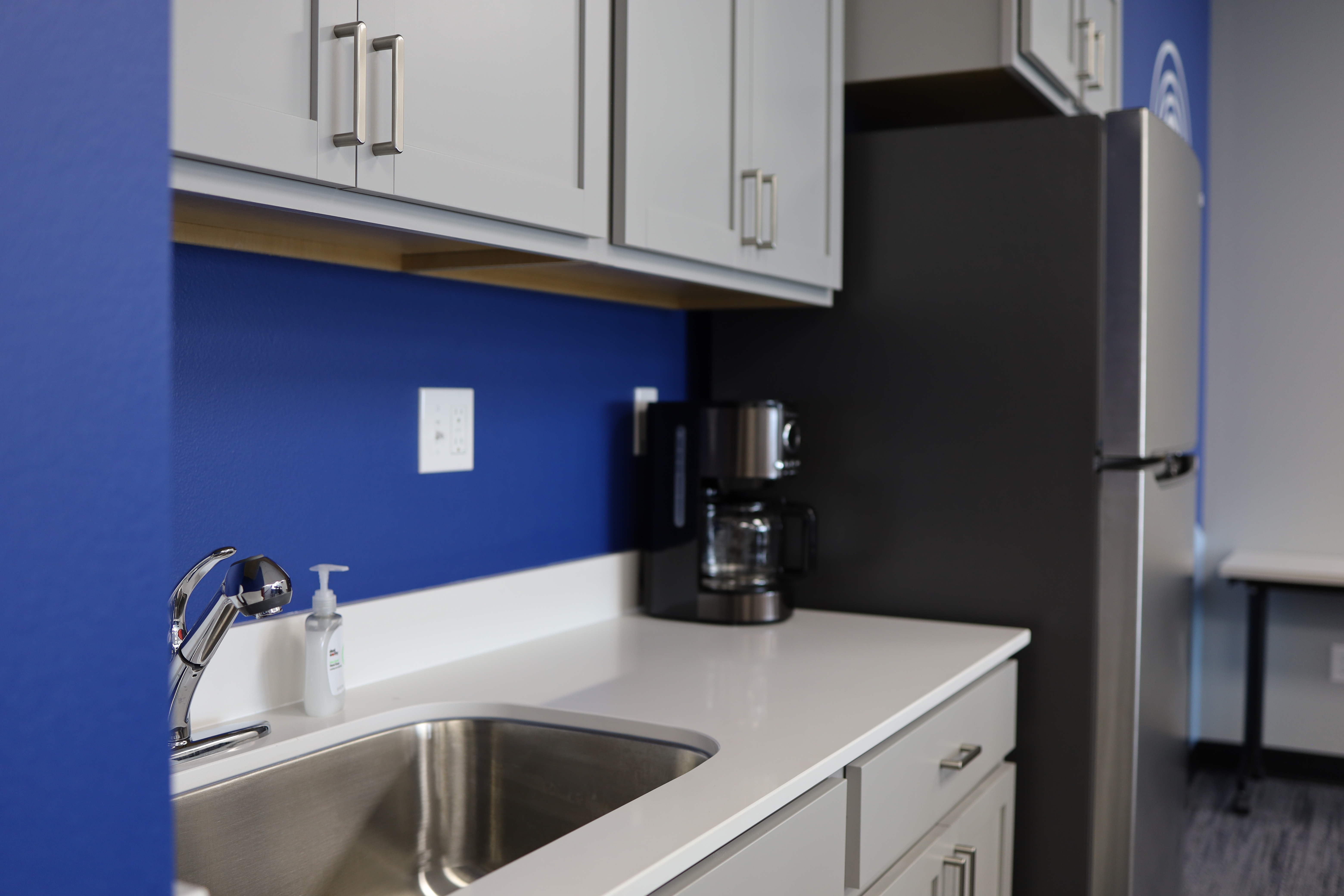 Refreshments may be served by the Renter or a caterer of the Renter’s choice. Food may not be cooked at the Hub. The kitchenette includes a sink and a residential-sized refrigerator/freezer.